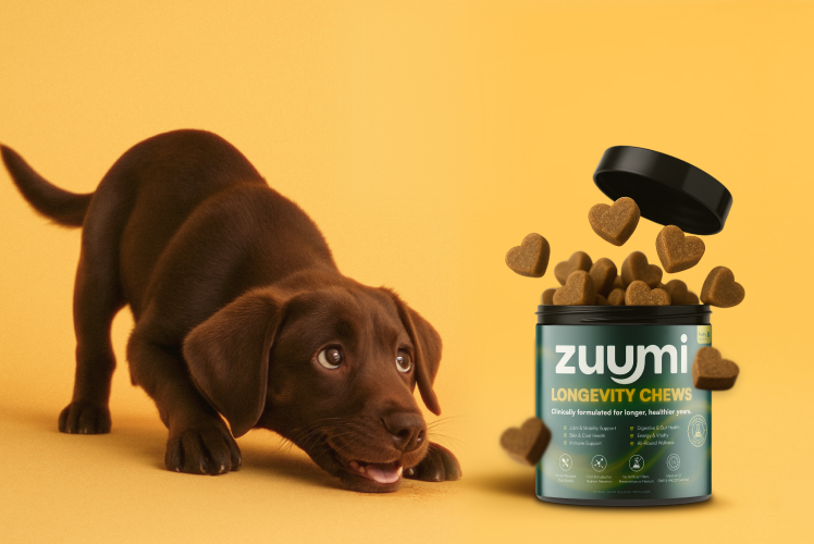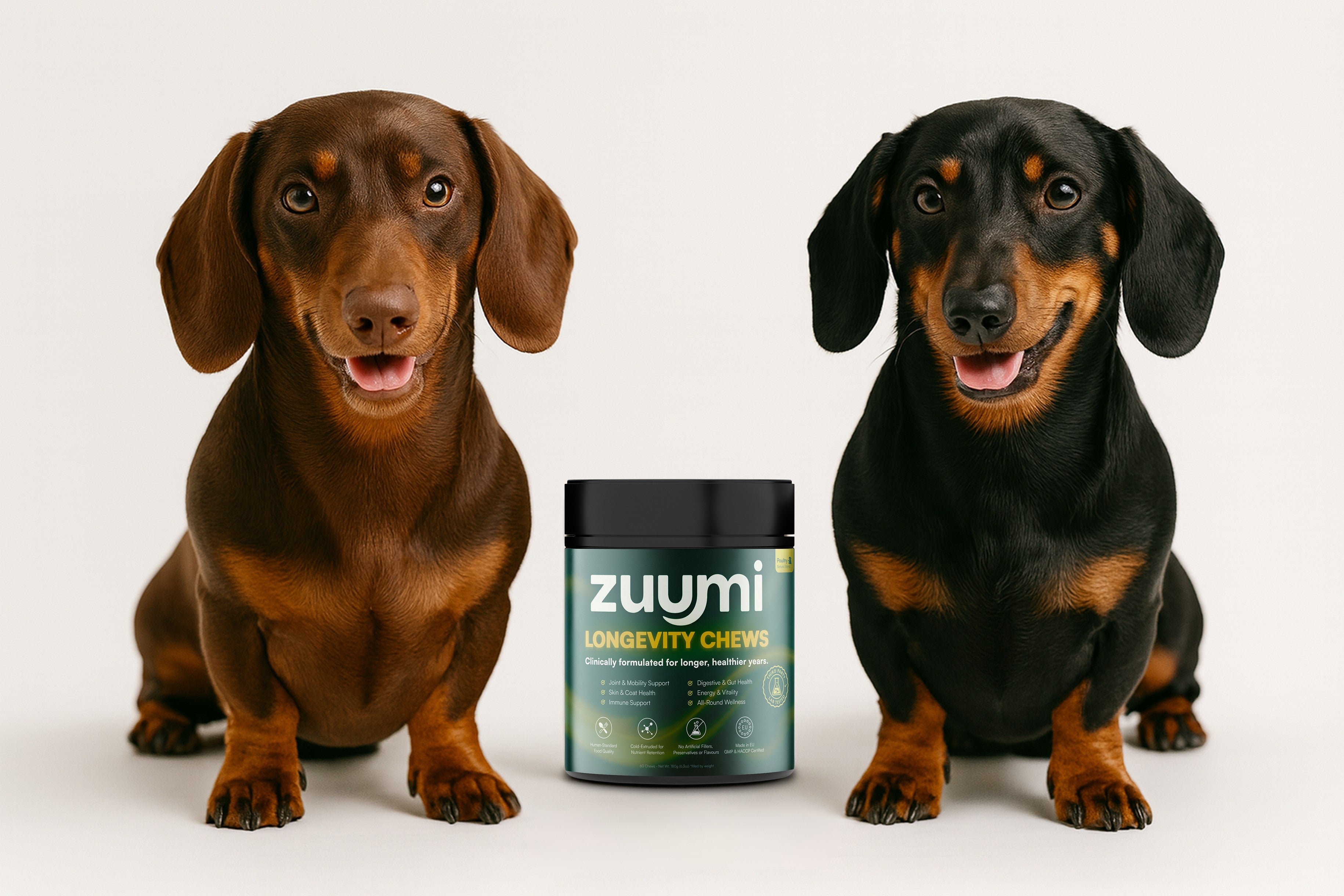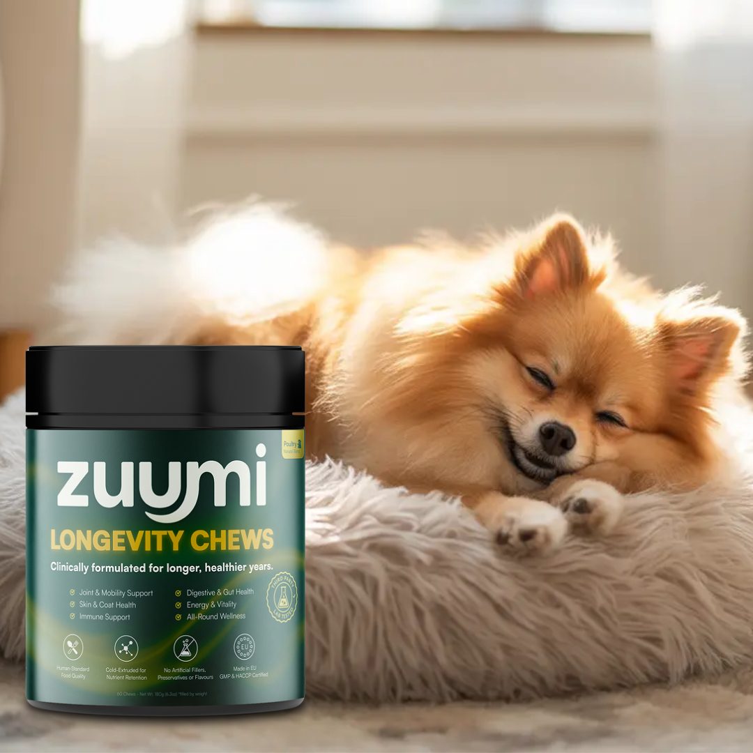 The ZUUMI formula targets the real causes of canine aging — not just the symptoms. Every active ingredient is chosen for its proven role in supporting long-term joint, cellular, and immune health. Glucosamine, MSM, chondroitin, and beef collagen strengthen cartilage and connective tissues, ensuring smooth movement and no pain. Antioxidants like vitamins C, E, and astaxanthin protect against oxidative stress, while B vitamins, vitamin A, and glycine support cellular repair, vitality, and metabolic balance.